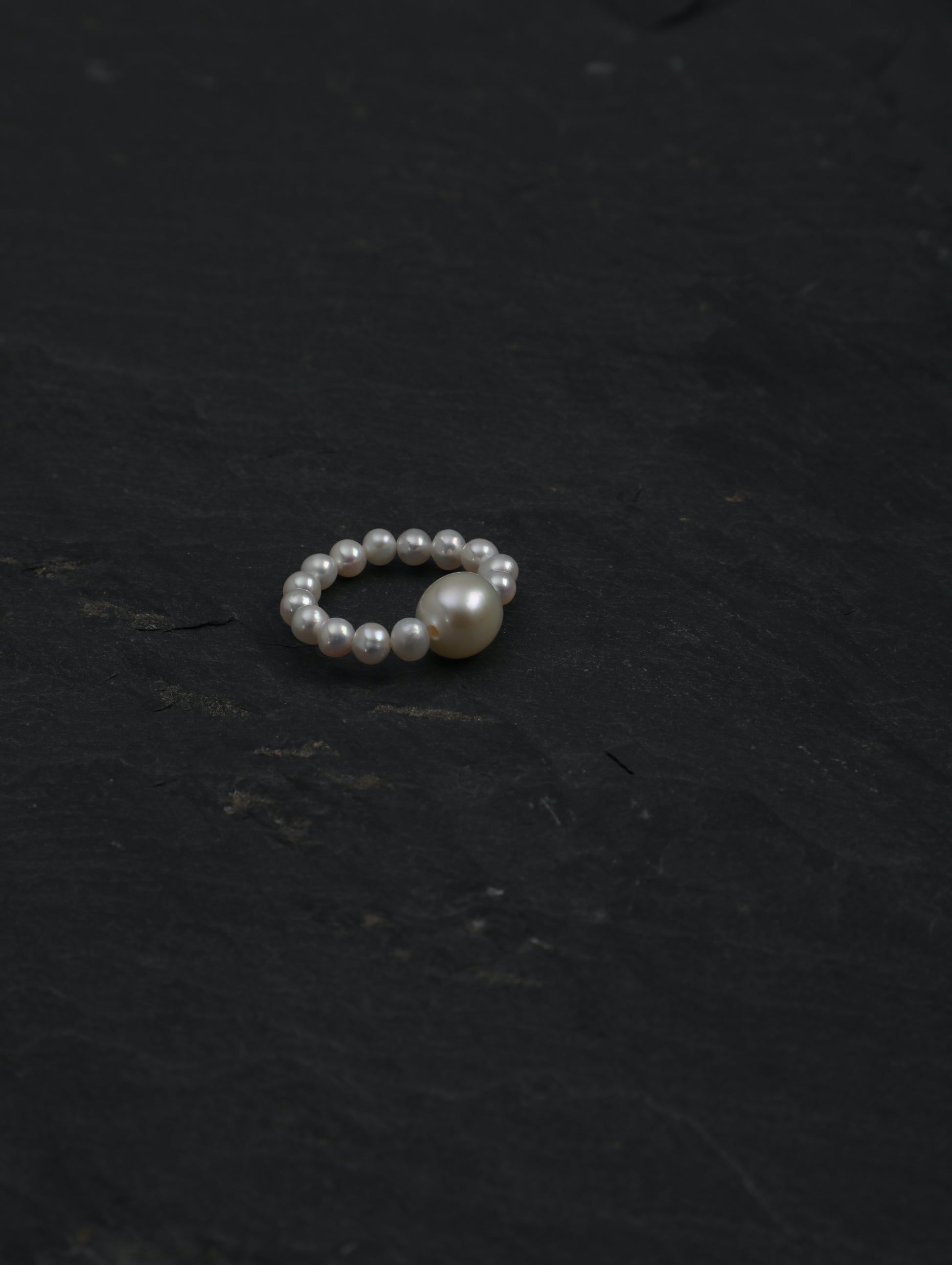 The pearl band is made entirely from natural freshwater pearls, allowing the ring to adapt comfortably to the finger while maintaining a refined, lightweight feel. Each piece is crafted by hand, embracing the natural variations that make every ring unique.